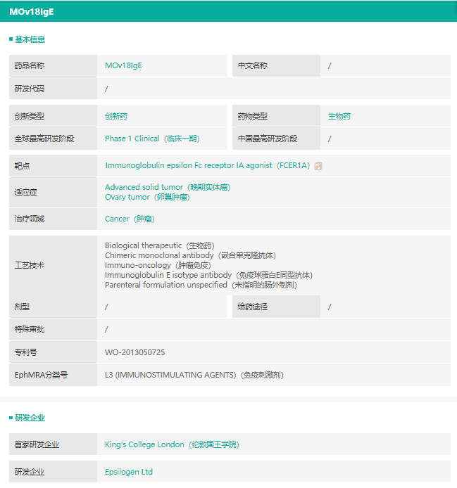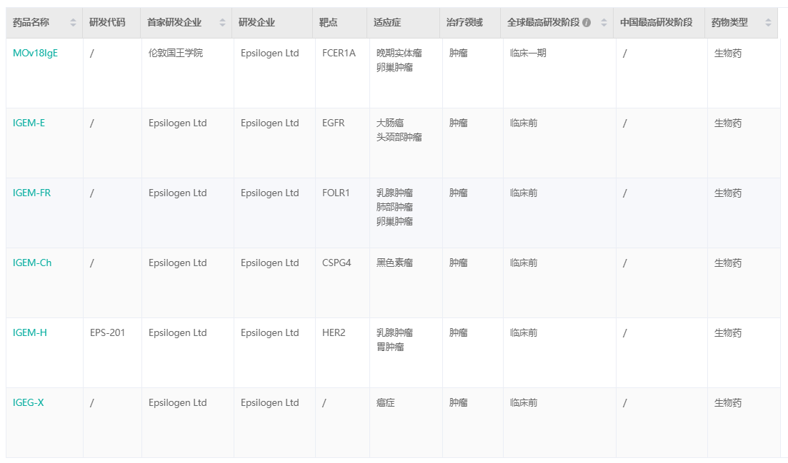 另外,据药融云数据库显示,Epsilogen 创新药产品管线除了 MOv18 外,还有5款正处于临床前阶段,且全都是针对肿瘤的治疗领域,卵巢肿瘤和乳腺肿瘤各占2款,其余各一款。
