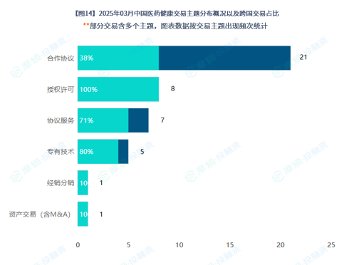 合作协议数量最多,发生21起。合作协议为2025年3月统计期间最重要的交易主题,而其中,跨国合作8起,占比38%;