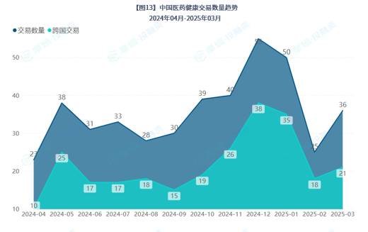 据摩熵投融资数据统计,2025年3月中国医药健康行业共发生交易37起,环比增加48.00%,同比增加27.59%,其中,跨国交易21起,占比56.76%。跨国交易数量环比减少16.00%,同比减少27.59%。