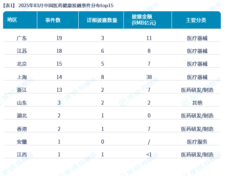 本月融资事件发生热度最高的地区是广东19起,江苏18起,北京15起;从摩熵投融资行业领域一级分类看,本月获投事件最多的领域赛道分别为医疗器械、医药研发/制造、医疗服务,本月融资事件发生数量分别为31起、26起、6起。