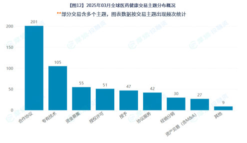 合作协议数量最多,发生204起。合作协议为2025年3月统计期间最重要的交易主题,表明医药行业的合作非常频繁且紧密,也凸显共同研发、生产及商业拓展的主流趋势。