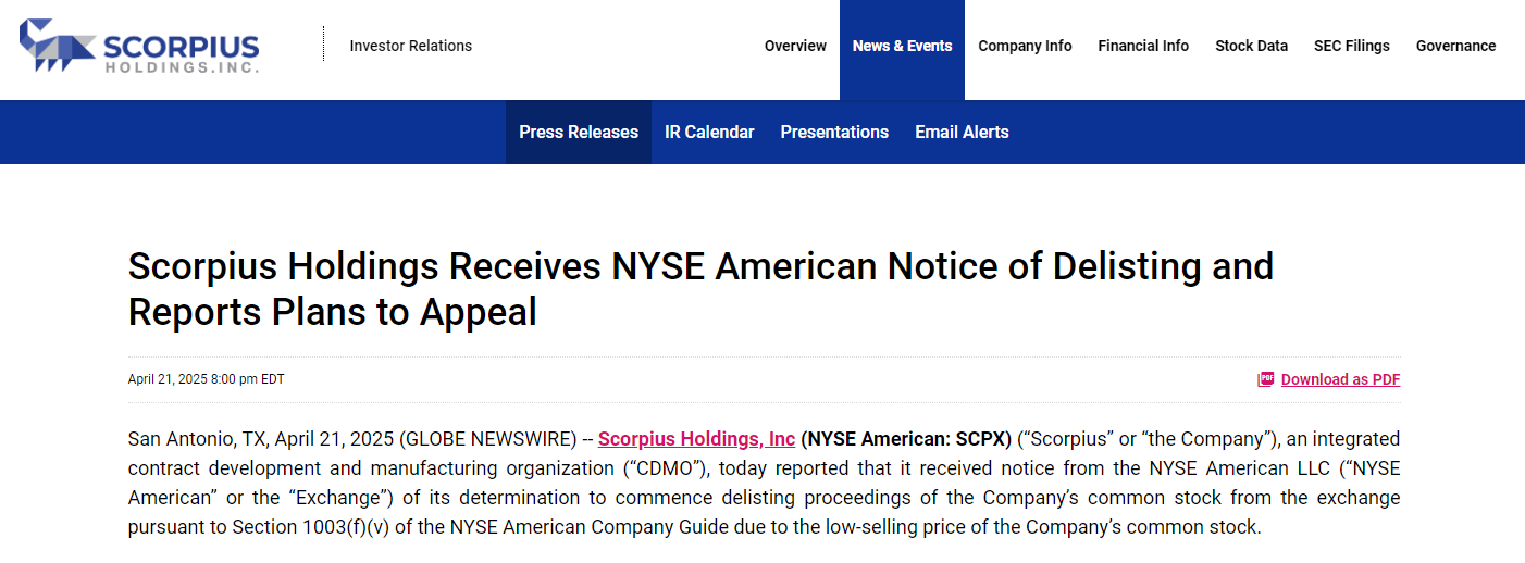 4月21日,CDMO公司Scorpius Holdings(股票代码:SCPX)已收到纽约证券交易所美国有限责任公司(NYSE American) 的退市通知。由于该公司普通股的售价低廉,纽约证券交易所监管部门决定根据纽约证券交易所美国公司指南第1003(f)(v) 条的规定,启动公司普通股从交易所退市的程序。