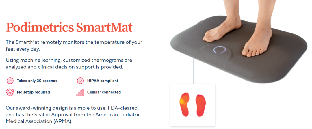 Podimetrics 成立于 2011 年,开发了 SmartMat——唯一一款易于使用的家用垫,患者每天踩踏 20 秒。该垫子可以检测足部的温度变化,这与炎症的早期迹象有关,通常是 DFU 的前兆。经 FDA 批准且符合 HIPAA 标准的 SmartMat 由 Podimetrics 的内部护士支持团队远程监控。如果垫子上的数据表明存在潜在的健康问题,Podimetrics 的护理团队会尽可能接近实时地与患者和患者的提供者联系。SmartMat 还获得了美国足病医学协会的批准印章,通过与领先的基于风险的医疗保健提供者以及地区和国家健康计划(例如退伍军人健康管理局)的合作,已经被数千名患者使用。