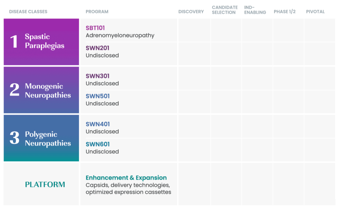 这是即将推出的一系列治疗脊髓相关疾病的基因疗法中的第一个。SwanBio尚未透露其其他基因疗法的靶点,但已表示正在研究痉挛性截瘫、单基因和多基因神经病变。