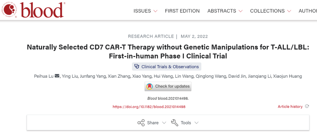 5月2日,陆道培医院陆佩华教授(第一作者和共同通讯作者)团队、森朗生物的首席科学家李建强教授(共同通讯作者)团队、北京大学人民医院黄晓军教授(共同通讯作者)合作在《Blood》发表了题为“Naturally Selected CD7 CAR-T Therapy without Genetic Manipulations for T-ALL/LBL: First-in-human Phase I Clinical Trial”的研究论文。该研究使用了森朗生物研发的患者或供者来源,无需额外进行CD7基因编辑或蛋白质表达阻断的「自然选择(Naturally Selected)」CD7 CAR-T细胞(NS7CAR) 的新产品,并在1项针对急性T淋巴细胞白血病(T-ALL/LBL)患者的1期临床试验中首次探索了NS7CAR疗法在人体内的安全性和有效性。