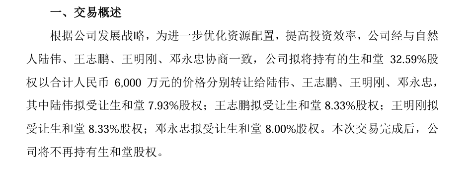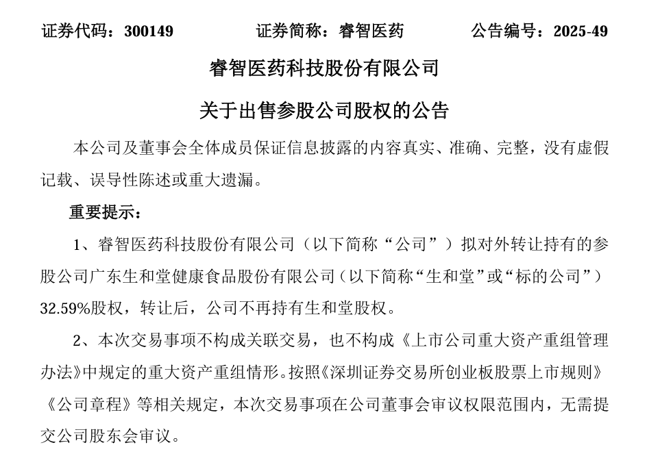 6月11日,国内CRO/CDMO领域龙头睿智医药发布公告,为进一步优化资源配置,提高投资效率,公司拟对外转让持有的参股公司广东生和堂健康食品股份有限公司(以下简称“生和堂”)32.59%股权,标的股份的转让价款为6,000万元。本次交易完成后,公司将不再持有生和堂股权。