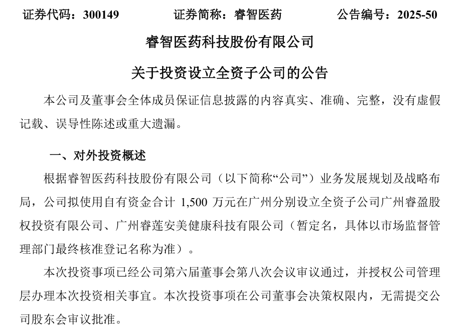 同时,睿智医药发布公告,公司拟使用自有资金合计1500万元在广州分别设立全资子公司广州睿盈股权投资有限公司和广州睿莲安美健康科技有限公司。本次投资事项已经公司第六届董事会第八次会议审议通过,并授权公司管理层办理本次投资相关事宜。