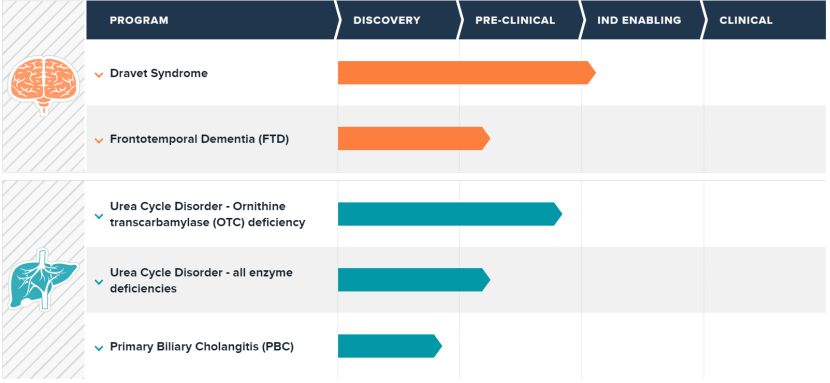 基于RAP™平台,CAMP4已经建立了肝脏和中枢神经系统的药物管线,而此次的融资,主要也是为了推进公司最主要的治疗Dravet综合征(一种严重的遗传性癫痫,80% 的 Dravet 患者 SCN1A 基因发生突变,导致钠通道表达降低,影响电活动,导致癫痫发作)临床候选药正式进入临床。