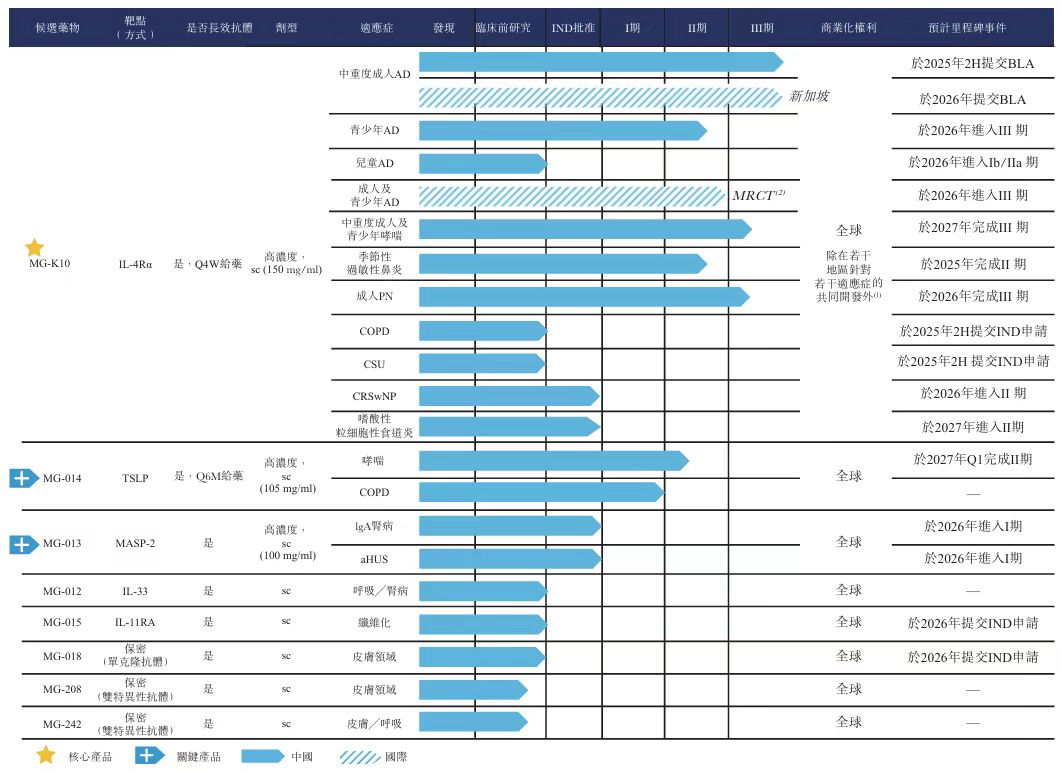 公司的核心产品MG-K10是一种潜在同类最佳、自主研发、处于注册临床阶段的长效抗IL-4Rα抗体,目前正针对特应性皮炎及哮喘等八种适应症进行或计划进行临床试验。