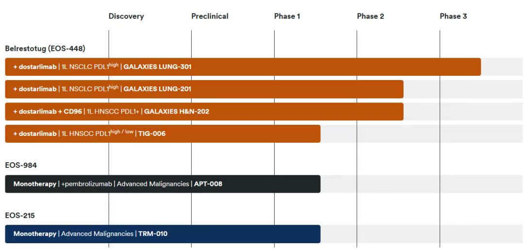 这些候选药物包括ENT1抑制剂EOS-984和抗TREM2抗体EOS-215,目前均处于实体肿瘤的1期开发阶段,以及一个临床前阶段的靶向ENT1的肥胖症项目。