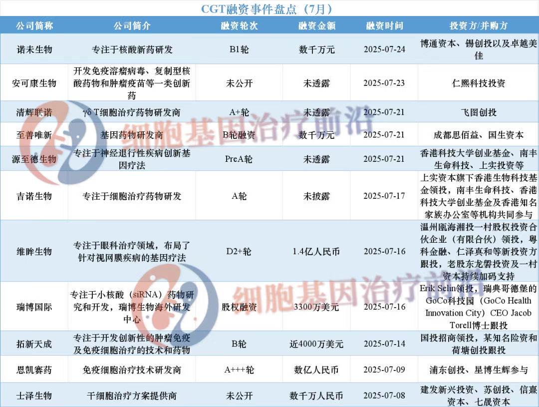 刚进入2025下半年,细胞与基因治疗(CGT)就给资本市场添了一把“火”。7 月 23 日,初创公司 Dispatch Bio 宣布斩获2.16亿美元A轮融资,一举刷新今年全球CGT领域单笔早期融资纪录。据不完全统计,2025年7月,国内已有11家CGT公司官宣完成融资,总披露金额超过7亿人民币。