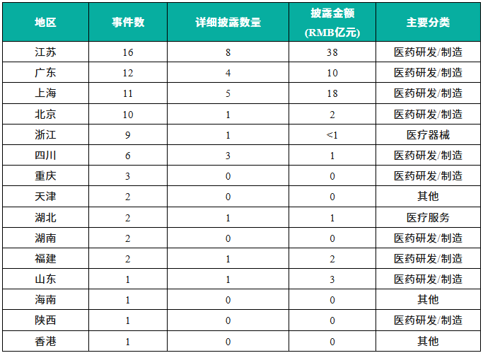 本月融资事件发生热度最高的地区是江苏16起,广东12起,上海11起;从摩熵投融资行业领域一级分类看,本月获投事件最多的领域赛道分别为医药研发/制造、医疗器械、综合服务,本月融资事件发生数量分别为41起、18起、5起。
