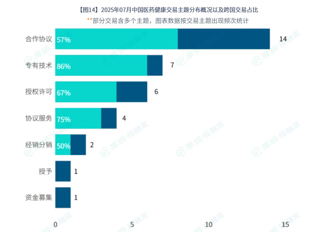 合作协议数量最多,发生14起。合作协议为2025年7月统计期间最重要的交易主题,而其中,跨国合作8起,占比57%。