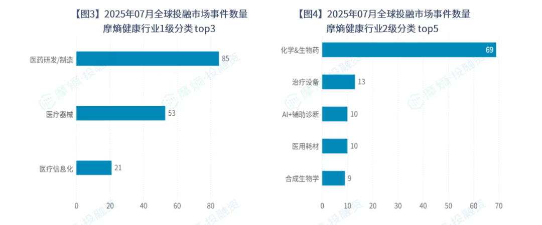 据摩熵投融资数据统计,2025年7月全球医药健康行业共发生投融资事件204起,环比减少10.13%,同比减少42.86%,其中披露详细金额事件106起,涉及金额约1457亿人民币。