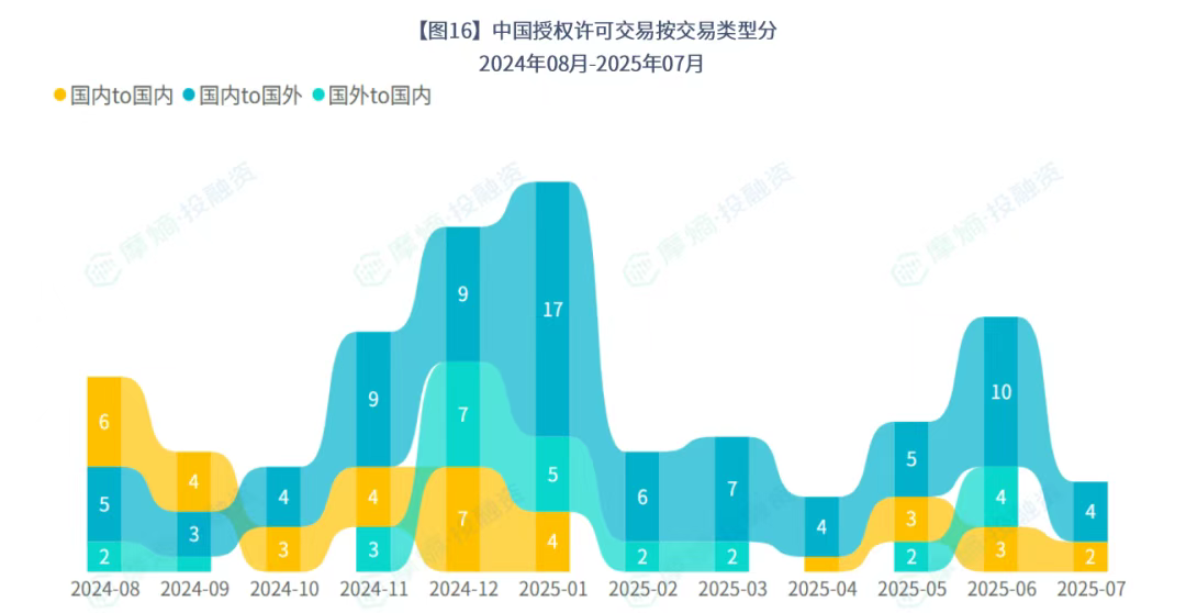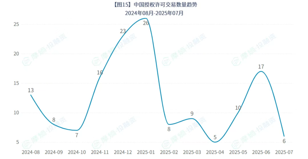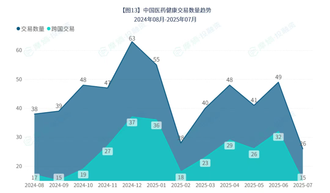 据摩熵投融资数据统计,2025年7月中国医药健康行业共发生交易26起,环比减少46.94%,同比减少43.48%,其中,跨国交易15起,占比57.69%。跨国交易数量环比减少69.39%,同比减少67.39%。
