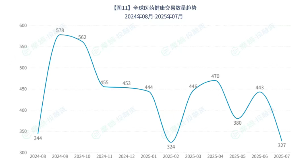 据摩熵投融资数据统计,2025年7月全球医药健康行业共发生交易327起,环比减少26.19%,同比减少30.28%。