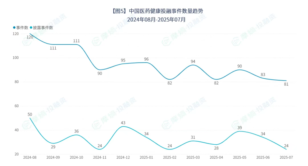 据摩熵投融资数据统计,2025年7月中国医药健康行业共发生投融资事件81起,环比减少2.41%,同比减少41.30%,其中披露详细披露事件24起,涉及金额超78亿人民币。