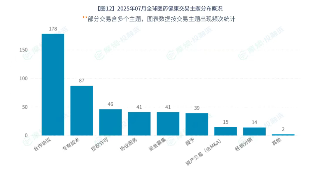 合作协议数量最多,发生178起。合作协议为2025年7月统计期间最重要的交易主题,表明医药行业的合作非常频繁且紧密,也凸显共同研发、生产及商业拓展的主流趋势。
