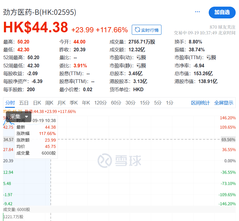 9月19日消息,劲方医药-B今日正式登陆港交所主板。独家保荐人为中信证券,开盘涨115.79% 。