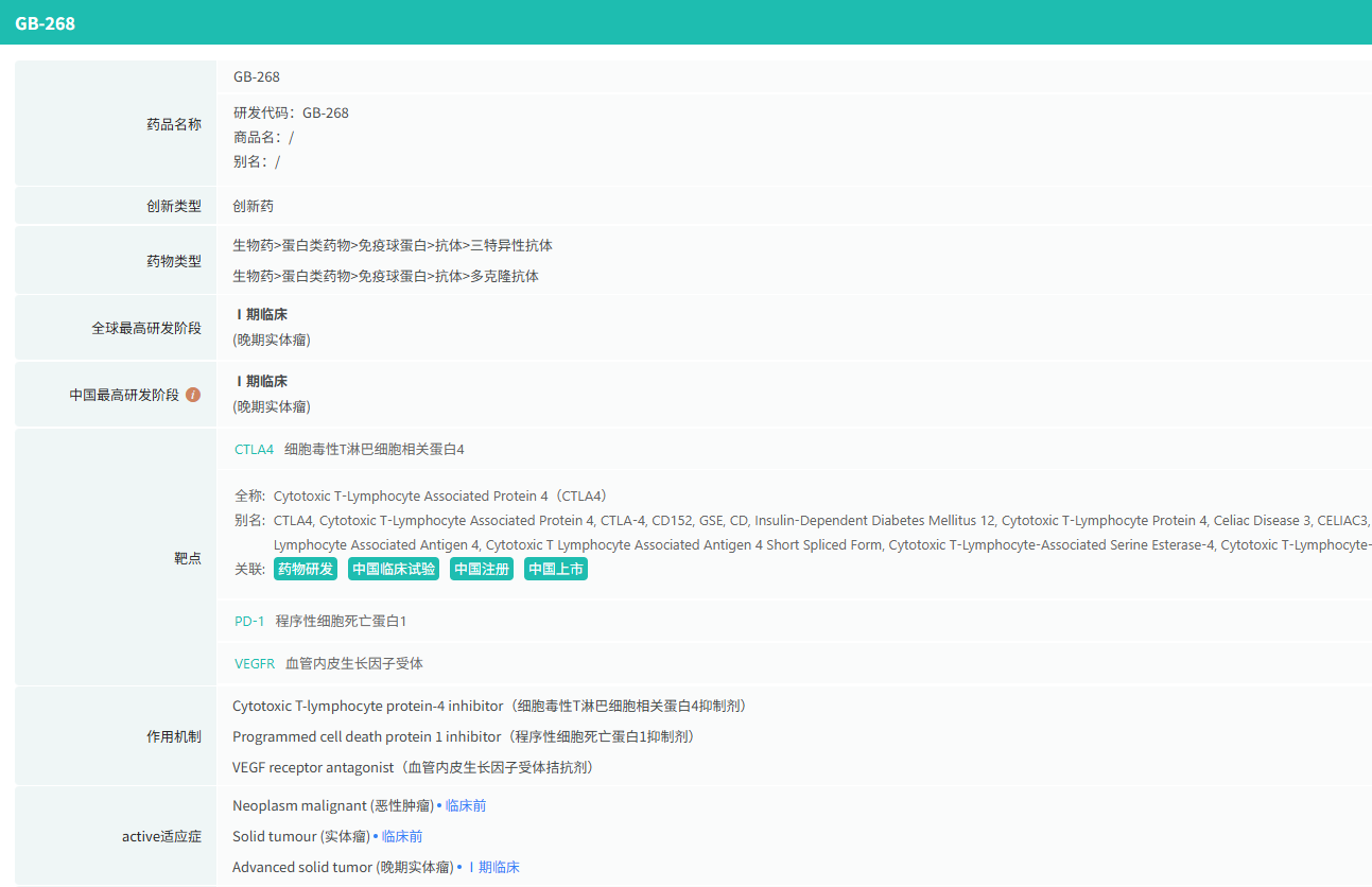 目前嘉和生物核心管线GB268 (抗PD-1/VEGF/CTLA-4,三特异性抗体) 是嘉和生物自主研发的一款有显着创新性的三特异性抗体,GB268 FIH临床试验申请已于2025年7月17日获NMPA批准。