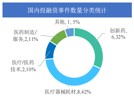 在这期间,国内医药大健康行业共发生投融资事件19起,较上周总数量减少了7起,其中创新药类6起,本周占比30%,相比上周的创新药投融资事件占比增加了22%;医疗器械耗材、医疗/医药技术、医药制造/服务及其他融资事件分别发生8起、2起、2起、1起。