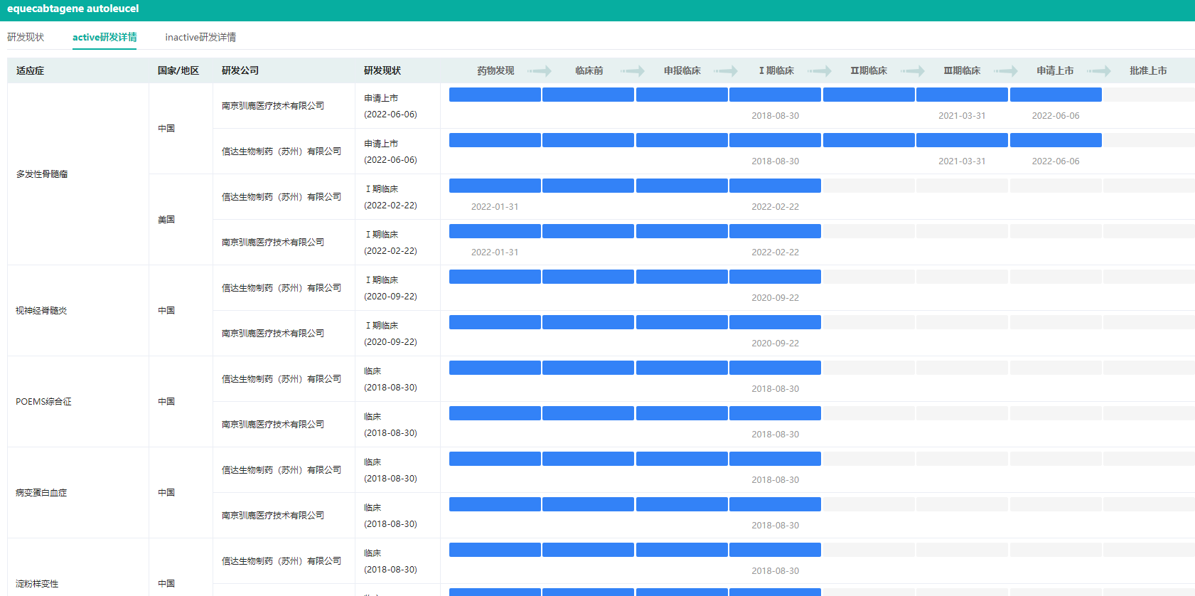 据药融云数据库统计,其现有8个在研品种处于不同研发阶段,其中进展最为迅速的产品CT103A(全人源BCMA嵌合抗原受体自体T细胞注射液)已处于临床开发后期阶段,于2021年2月被CDE纳入“突破性治疗药物”品种。CT103A是信达生物与驯鹿医疗联合开发的抗BCMA CAR-T细胞注射液,拟用于治疗复发/难治性多发性骨髓瘤。