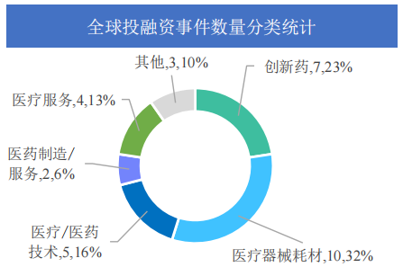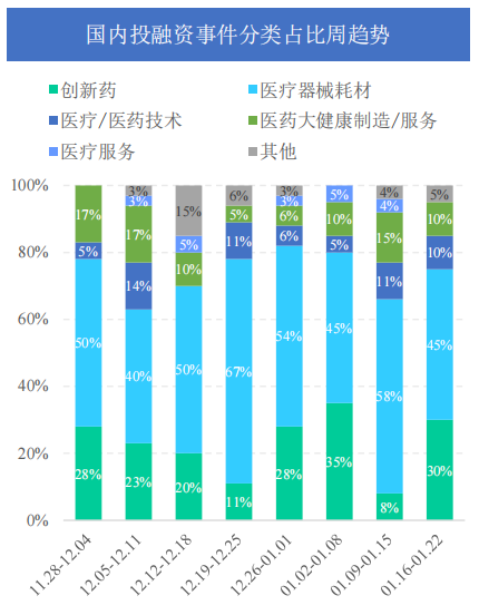 据《药融云医药行业观察周报》统计,在2023年1月16日-1月22日期间,全球医药大健康行业共发生投融资事件31起,较上周数量减少59起,其中创新药类融资共7起,医疗器械耗材投资热度也较高,本周占比为32%,为10起。
