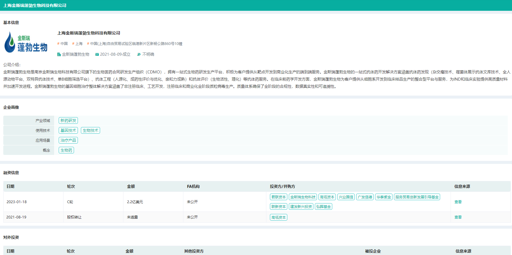 2023年1月17日,南京金斯瑞生物科技的子公司金斯瑞蓬勃生物宣布约2.2亿美元的C轮融资。该公司称,这笔融资是2022年下半年至今国内最大规模的CDMO产业融资,将用于生物药及基因和细胞治疗CDMO业务的产能扩张及技术平台升级。