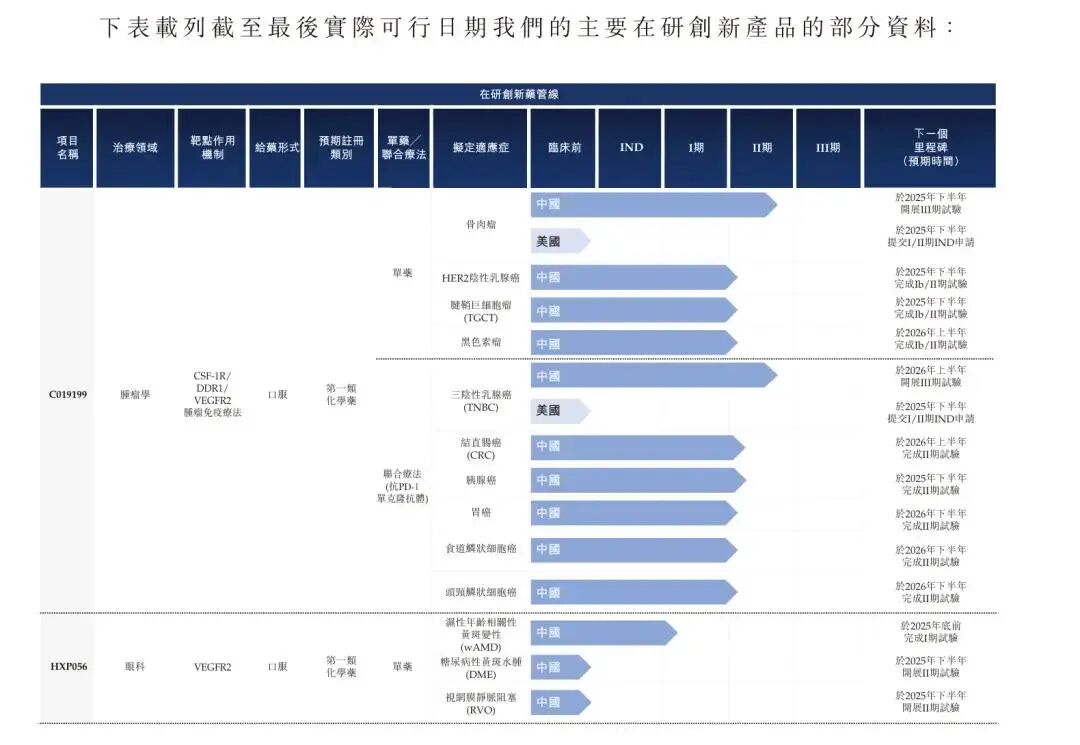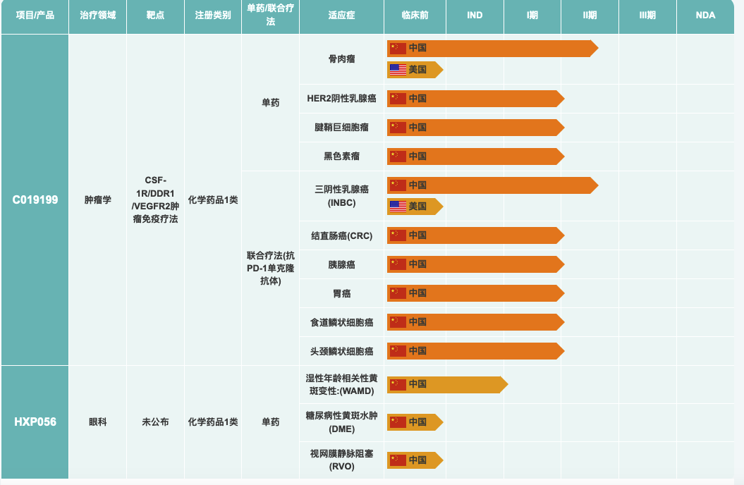 小分子HXP056旨在用于治疗眼底病,如湿性年龄相关性黄斑变性、糖尿病性黄斑水肿及视网膜静脉闭塞,目前开发的为口服制剂。靶点为VEGFR2。