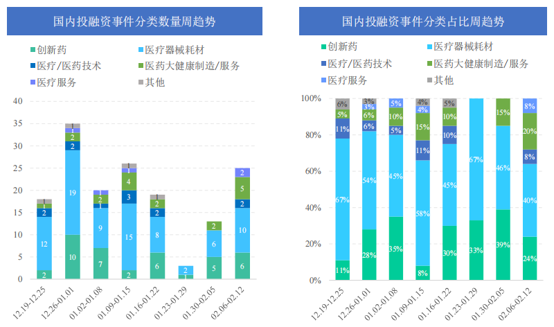 根据《药融云医药行业观察周报》统计,在2023.02.06-2023.02.12期间,全球医药大健康行业共发生投融资事件74起,较上周数量增加12起,其中创新药类融资共24起,医疗器械耗材投资热度也较高,本周占比为28%,为21起。