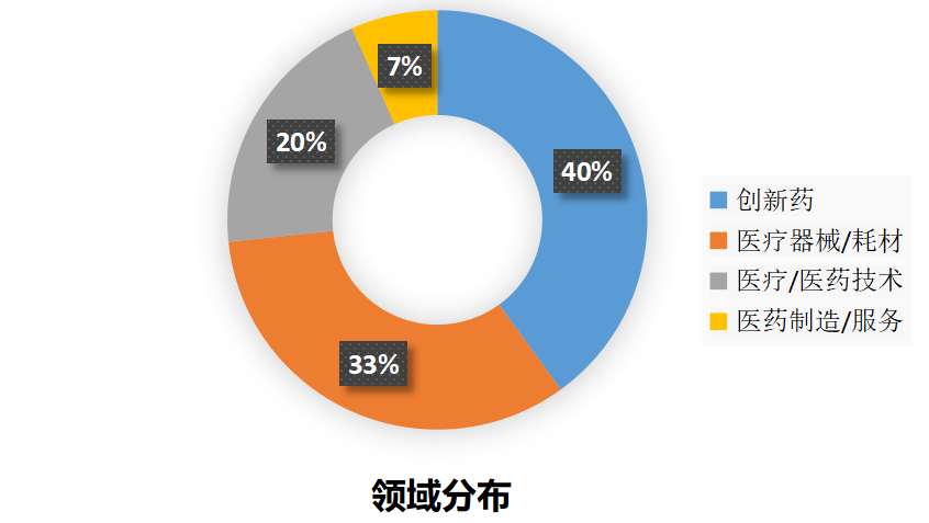本周生物医药投融资在创新药领域较为活跃,共发生6起,占比40%。随后为医疗器械/耗材领域,有5起。