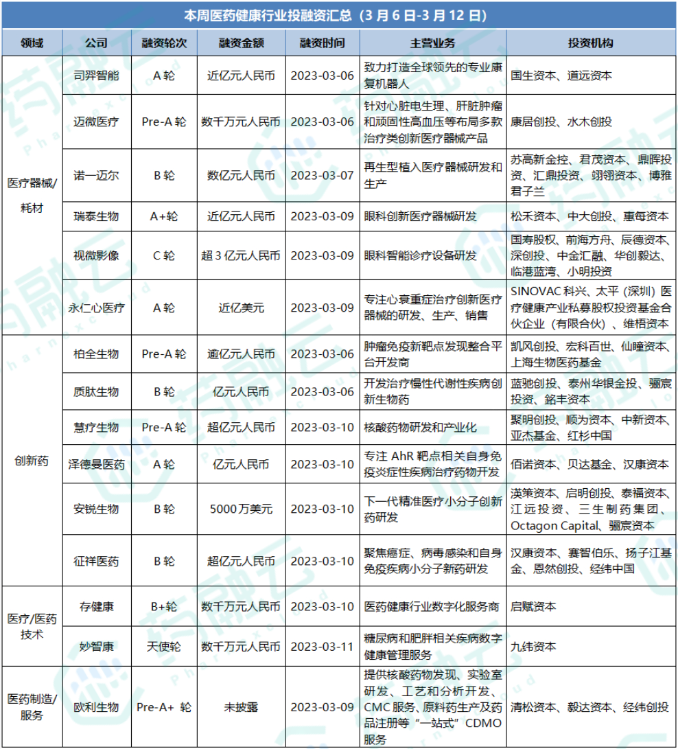 据药融云数据库统计,本周(3月6日-3月12日)全国医药健康行业共发生15起生物医药投融资事件。具体领域包括:医疗器械/耗材(6起,40%),创新药(6起,40%),医疗/医药技术(2起,13%),医药制造/服务(1起,7%)。