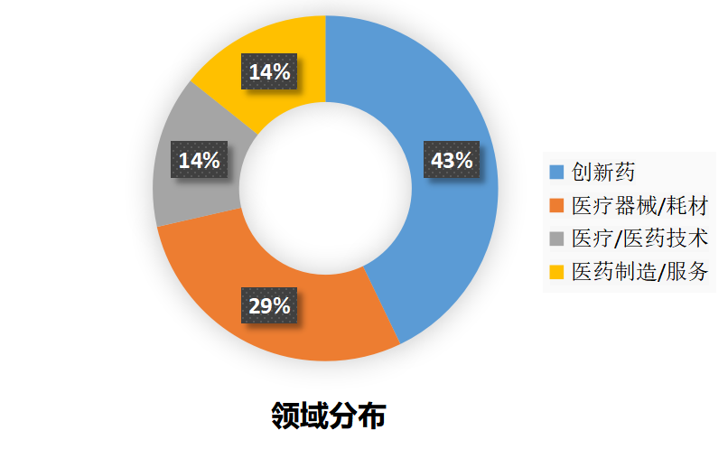 具体领域包括:创新药(3起,43%),医疗器械/耗材(2起,29%),医疗/医药技术(1起,14%),医药制造/服务(1起,14%)。