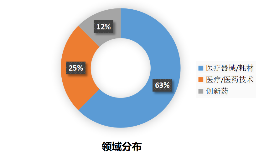 具体领域包括:医疗器械/耗材(5起,63%),医疗/医药技术(2起,25%),创新药(1起,12%)。