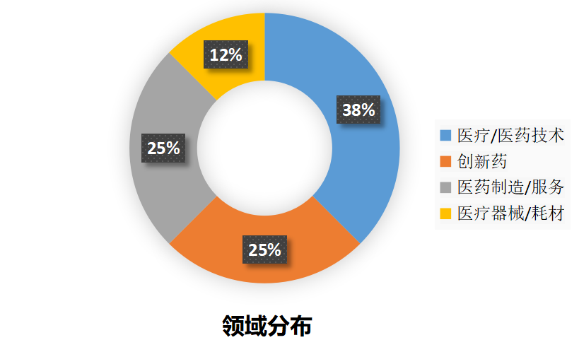 具体领域包括:医疗/医药技术(3起,38%),创新药(2起,25%),医药制造/服务(2起,25%),医疗器械/耗材(1起,12%)。