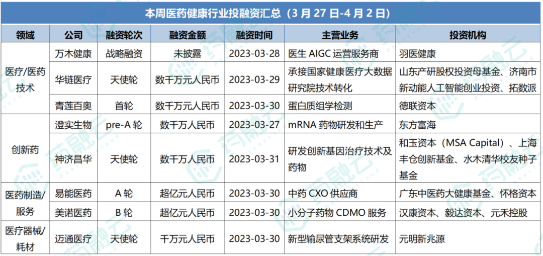 本周生物医药投融资轮次主要集中在天使轮,共3起。