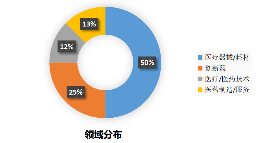 具体领域包括:医疗器械/耗材(4起,50%),创新药(2起,25%),医疗/医药技术(1起,12%),医药制造/服务(1起,13%)。