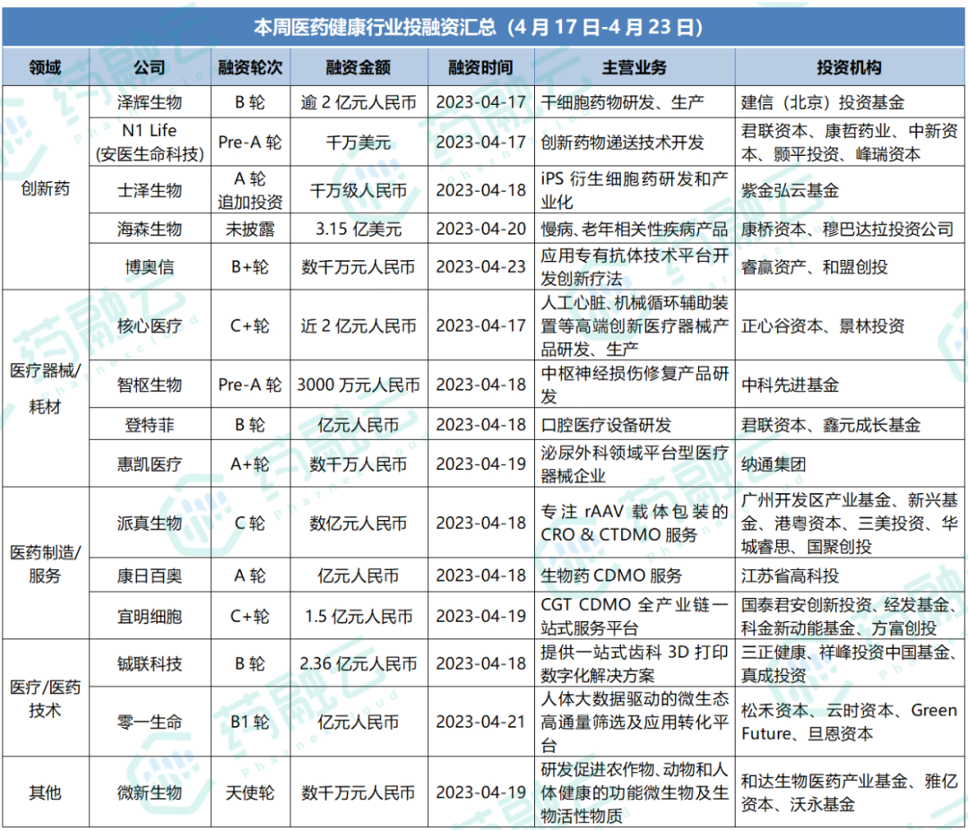 4月17日-4月23日生物医药投融资事件汇总