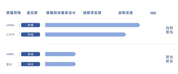 目前,公司已搭建了几十人的研发、工艺开发及质量管理团队,全力推动管线开发。利用载体靶向技术优势,迪纳元昇已在肿瘤、代谢类疾病、疫苗等治疗领域展开了丰富的管线布局,递送载体已在动物水平获得了不同维度的安全性数据,核心管线已进展至PCC确证阶段。