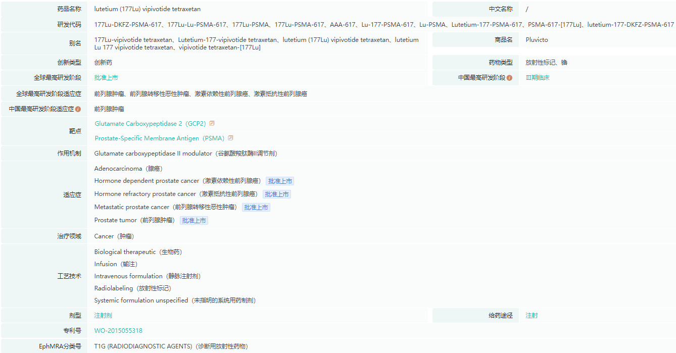 在诺华获批的RDC药物中,Lutathera是 FDA 批准的第一个治疗胃肠胰神经内分泌肿瘤的放射性药物。2018年获批至今,其累积销售额已超过20亿美元。2022年3月,诺华第二款治疗型核药Pluvicto®(177Lu-PSMA-617)获批,用于治疗PSMA阳性、经治疗进展的前列腺癌。