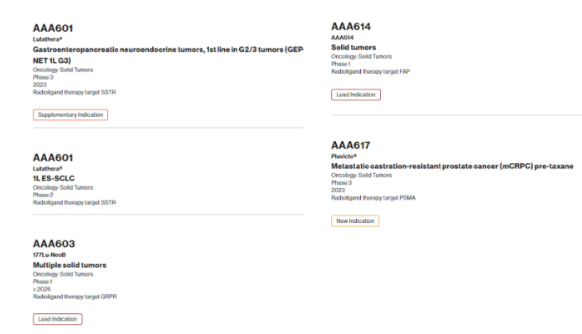 目前诺华在核药领域共布局了5条管线,涉及广泛期小细胞肺癌、胃肠胰神经内分泌肿瘤、实体瘤、转移性去势抵抗性前列腺癌(mCRPC)等领域。