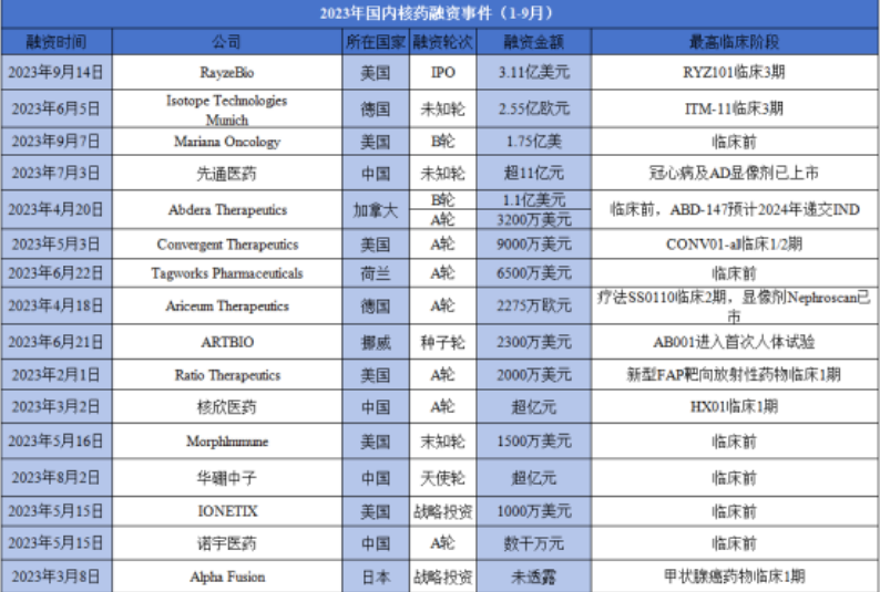 据不完全统计,2023年1-9月全球核药领域共发生17起融资事件,融资总金额突破13亿美元。国内市场,东诚药业、中国同辐、恒瑞医药、远大医药、先通医药等本土企业均在加速布局。今年,国内核药领域就有4起融资,所涉及的药物类型包括放射性疗法、抗肿瘤创新疗法、个体化细胞疗法等。其中,先通医药超11亿元的融资,成为国内医疗健康领域2023年最大一笔融资,引发业内关注。