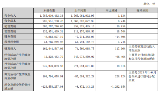 据2023年半年报显示,东诚药业实现营业收入17.85亿元,同比增长1.13%。归属于上市公司股东的净利润1.84 亿元,同比增长9.23%。营业成本9.89亿元,同比下降;其中研发费用支出1.63亿元,同比增长117.96%,主要是研发活动投入增加所致。