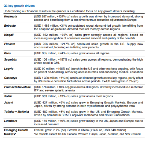 其增长引擎包括核药Pluvicto(+217%),Q3营收2.56亿美元,前三季度营收达7.07亿美元。CD20抗体Kesimpta(奥法妥木单抗)(+124%)、Entresto(沙库巴曲缬沙坦钠)(+31%)、CDK4/6抑制剂Kisqali(瑞波西利)(+76%)和Scemblix (+157%)。