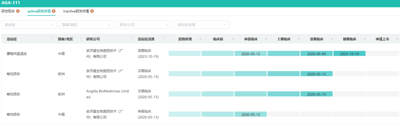 药融云数据库显示,2023年10月16日,安济盛生物的1类创新药 AGA111(适应症:需行脊柱单节段椎体间融合术的退行性椎间盘疾病)已获得中国国家药品监督管理局(NMPA)批准开展III期临床试验(受理号:CXSL2300502)。