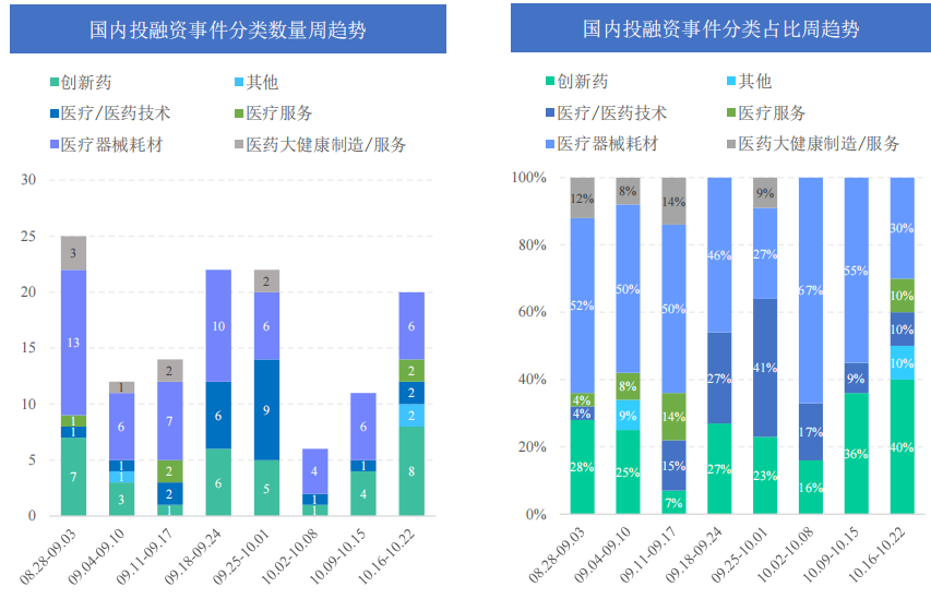 长久以来,医药投资被认为是一个长坡厚雪的朝阳产业。据《药融云医药行业观察周报》数据统计,在2023.10.16-2023.10.22期间,全球医药大健康行业共发生投融资事件66起,较上周数量增加了23起,其中创新药类融资共21起,医疗器械耗材投资热度也较高,本周占比为29%,为19起。
