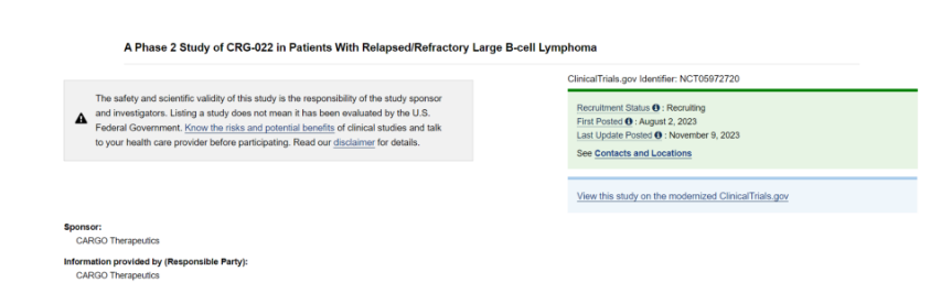 CRG-022为CARGO Therapeutics目前主要候选药物,利用表达CD22靶向CAR的慢病毒载体(m971-BBZ)进一步转导到自体T细胞而构成。目前CRG-022正进行I期临床试验,中期结果显示,对38例CD19 CAR-T细胞治疗后复发/难治性大B细胞淋巴瘤(R/R LBCL)患者,CR与ORR分别达到53%和68%。