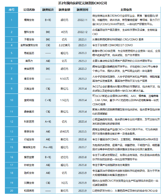 据浙商证券统计,2023Q1-Q3中国医疗健康投融资回落到2017Q1-Q3水平,全球回到2018-2019年水平。寒风虽凛冽,然泥沙并不俱下,资本始终会和优秀者同行。据不完全统计,2022-2023年国内有超过20家CXO获得超亿元大额融资,我们来有哪些特色公司。