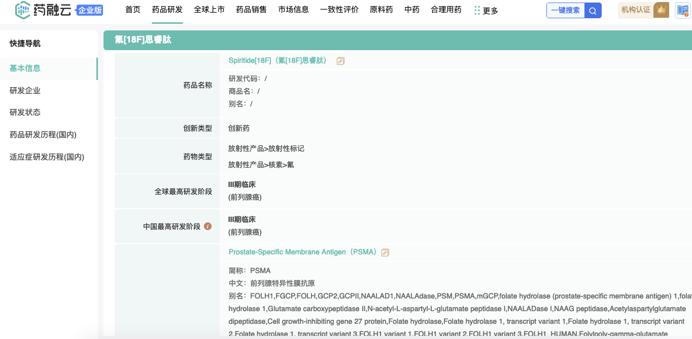 公司最早进入临床的候选分子:氟[18F]思睿肽注射液(Spiritide[18F])作为在国内外均未上市的化学药品1 类创新药,是一种靶向PSMA的放射性体内诊断药物,可通过与 PSMA 蛋白具有较高的特异性和亲和力,在 PSMA 高表达的肿瘤中高度浓聚,从而可以将氟[18F]带至前列腺癌患者 PSMA 表达阳性部位,采用正电子发射断层扫描(PET)成像技术实现诊断目的。