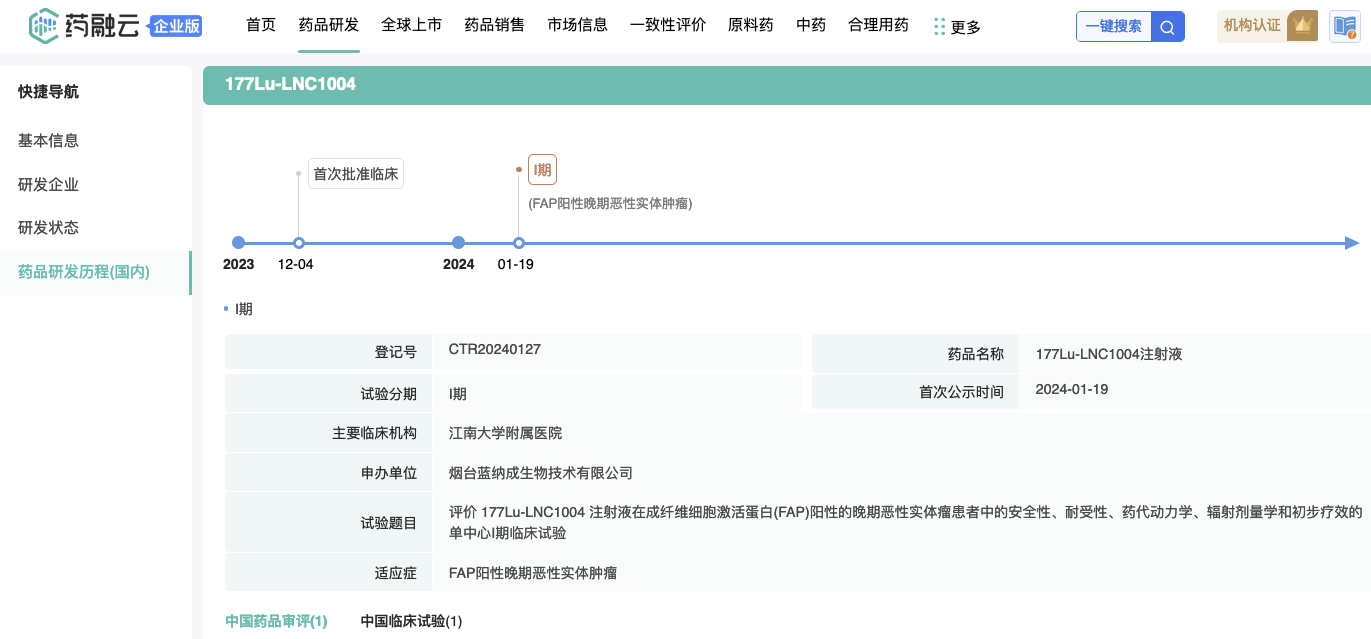 药融云数据显示:2021年1月,东诚药业携手国际顶级分子影像及纳米医学领域专家陈小元教授联合创立蓝纳成。作为东诚药业的核药创新研发平台,依托伊文思蓝纳米专利技术,蓝纳成致力于1.1类放射性诊疗一体化创新药物的研发。
